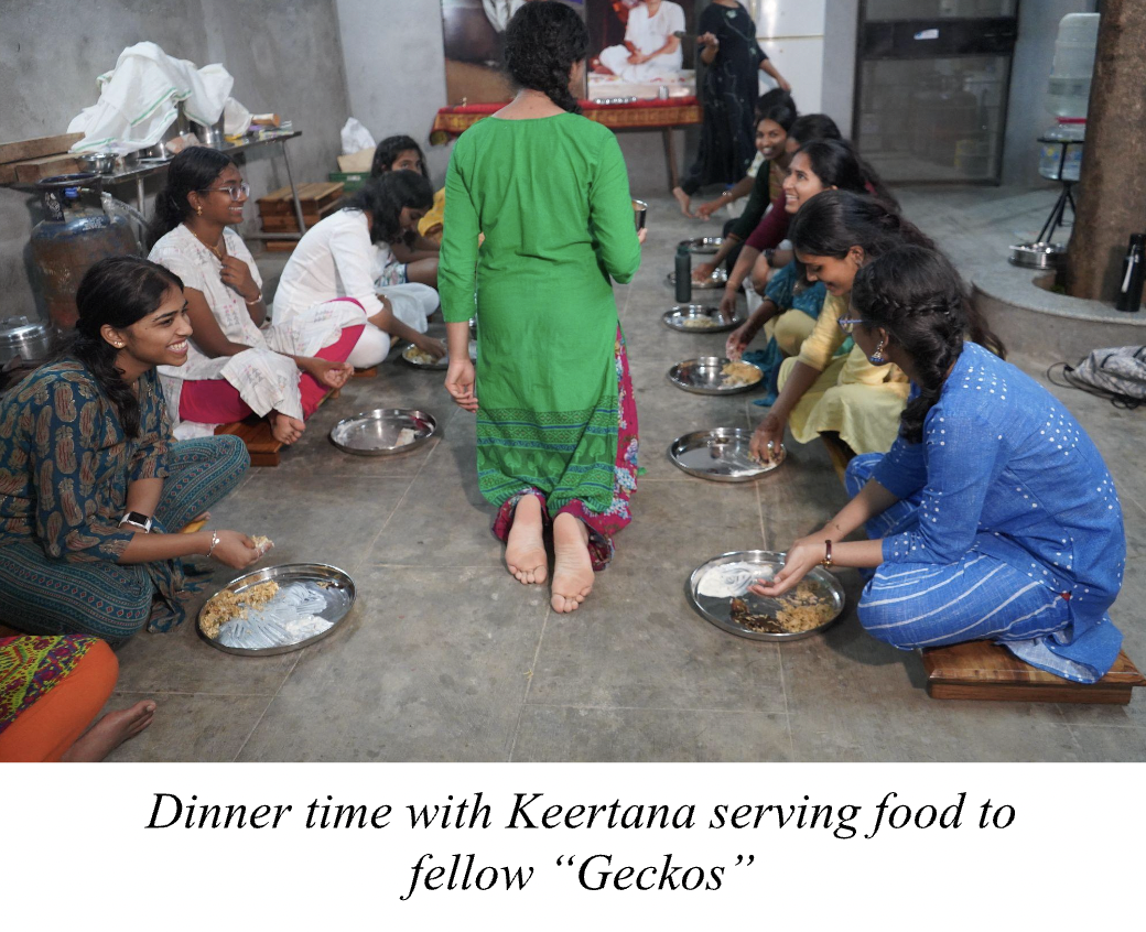 After visiting Poondi Swami’s temple with my family, where I saw Hasita and Keerthi (fellow “Geckos”) for the first time, we headed to Haritachala. Before entering, I was a bit nervous because it was going to be two weeks away from my family, and I had also not met the other girls in a very long time. However, my parents reassured me that Baba and Guruji would take care of everything and that I should not worry. As soon as I entered, people began wishing me “Happy Birthday,” as if they had known me forever. No matter how many years it was since I last saw them, the happiness and comfort were precisely the same – abundant.