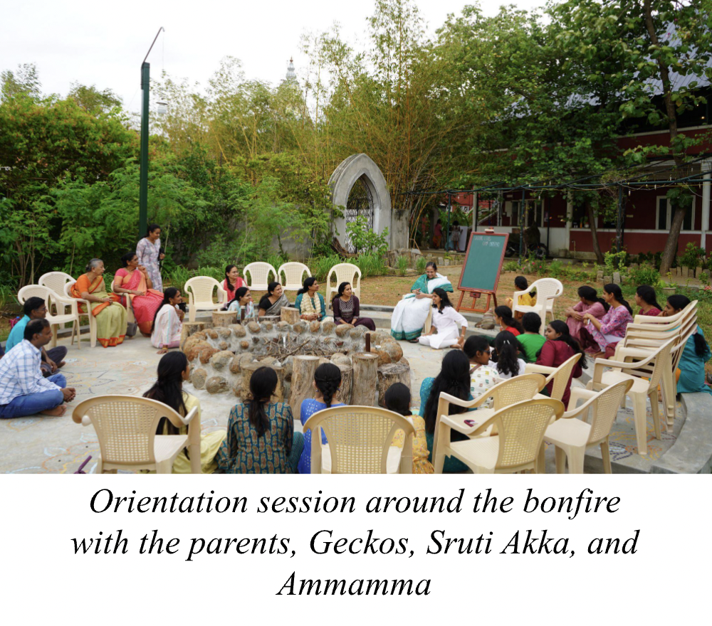As soon as Sruti Akka and Ammamma entered, we began the orientation around the bonfire along with our parents. Sruti Akka went over the main objectives of this camp, and we were all more than elated to be there. As we all huddled in a circle listening to Akka, all the worries were gone. She began explaining how this camp is meant to create meaningful relationships (as gurubandhus, we all understand a bigger part of each other, often left out of other friendships), the importance of a digital detox (no phones for two weeks), communal living (sleeping together, sharing bathrooms), tools to improve our mental health (meditation, body scanning techniques, yoga), developing deeper connections with Baba and Guruji (silently sitting in the temple every morning), and improving our connection with nature (living as a part of it, rather than apart from it).